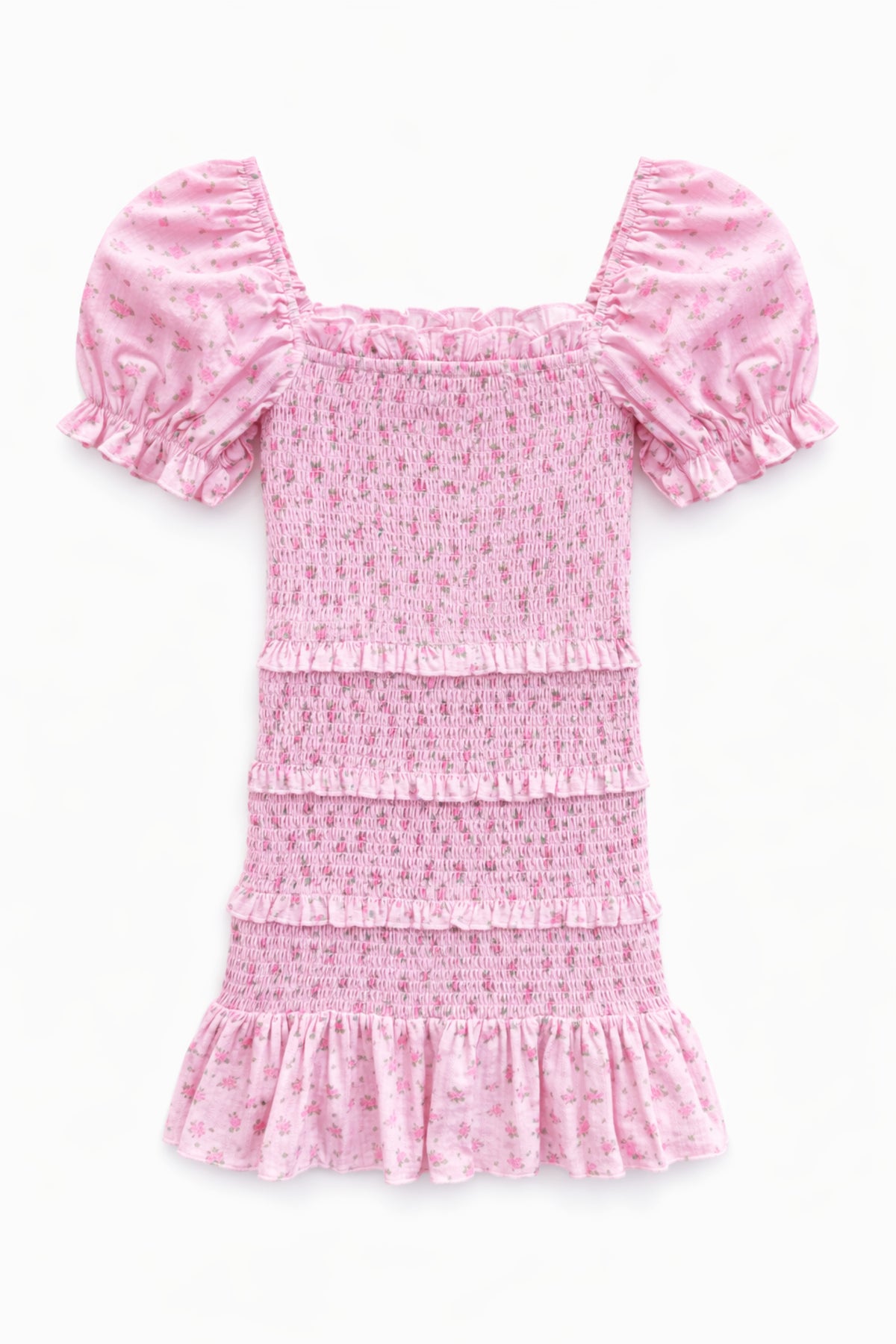 • Tiered smocking with flounce hem.